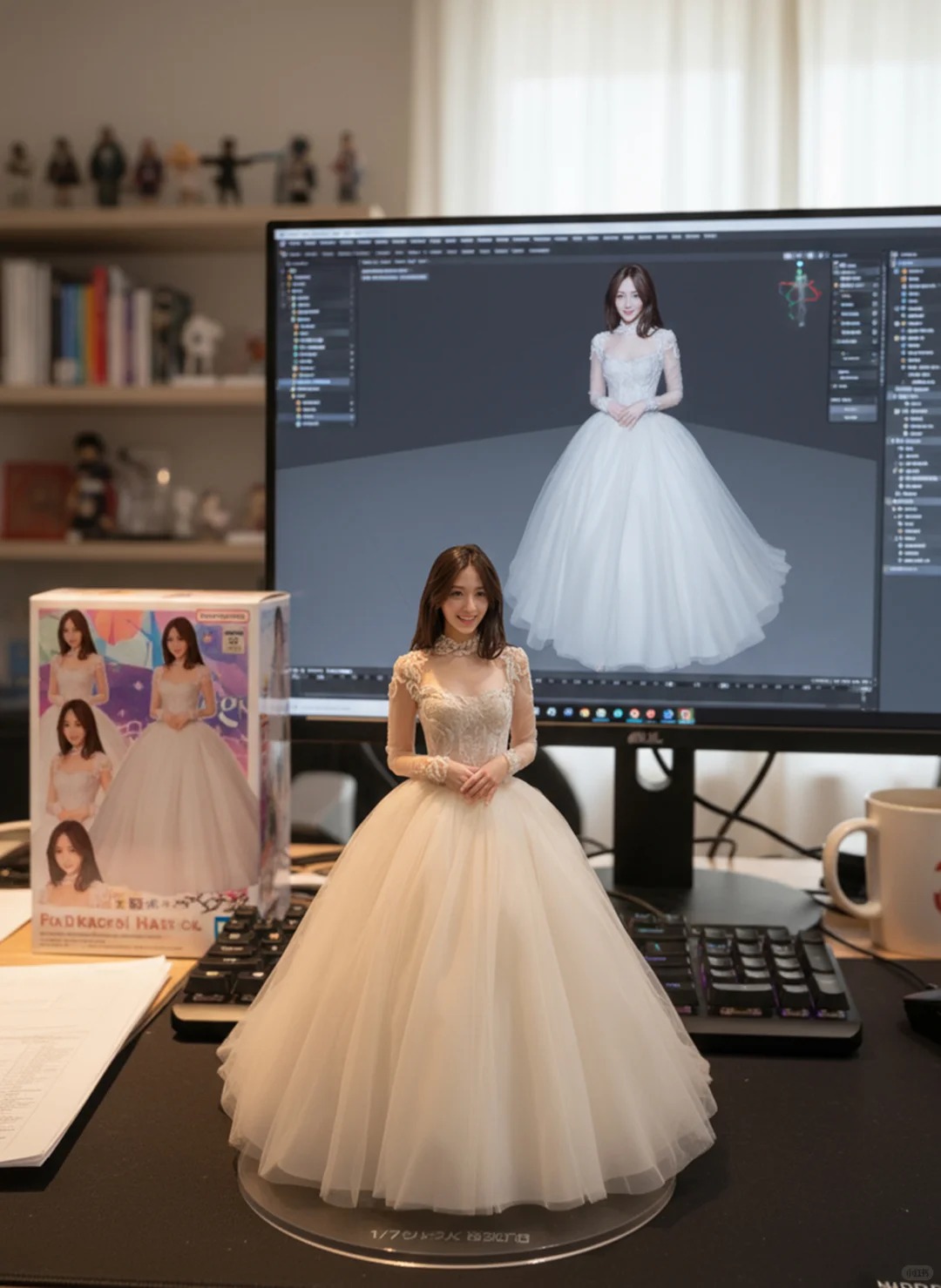 人偶站立于无文字标识的圆形水晶透明亚克力底座上。显示器屏幕正生动显示ZBrush软件界面,其中可见同一角色3D模型的中期建模阶段(线稿渲染模式可见)。桌面右后方陈列着万代风格的包装盒,盒身印刷着原始角色艺术图,质感精美无瑕。